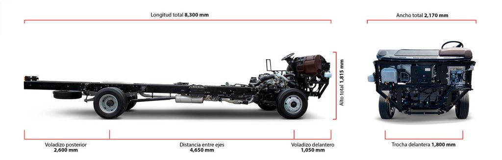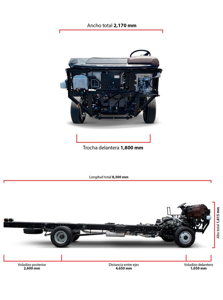 Embrague monodisco en seco de control hidráulico de 350mm, transmisión mecánica de 6 velocidades (sincronizadas de 2da-6ta) más reversa. Dirección hidráulica tipo tuerca y bolas recirculantes y frenos de servicio full aire con ABS con delanteros y posteriores tipo tambores. Freno de Escape electroneumático con válvula de accionamiento al escape con retardador electromagnético.