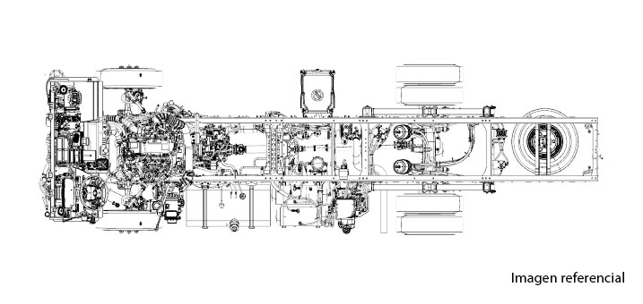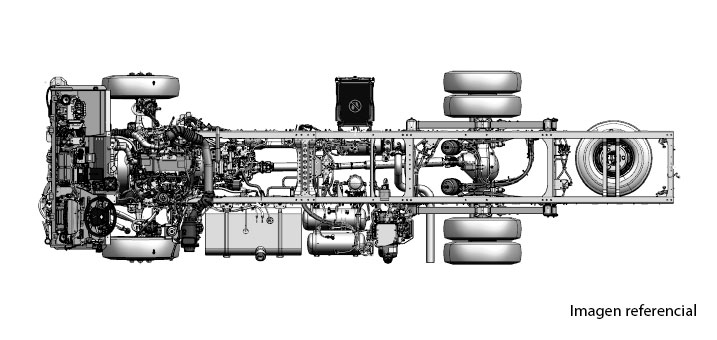 Embrague monodisco en seco de control hidráulico de 350mm, transmisión mecánica de 6 velocidades (sincronizadas de 2da-6ta) más reversa. Dirección hidráulica tipo tuerca y bolas recirculantes y frenos de servicio full aire con ABS con delanteros y posteriores tipo tambores. Freno de Escape electroneumático con válvula de accionamiento al escape.